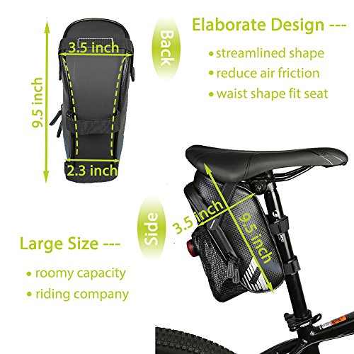 Waterproof Saddle Bag: Item size: 2.7 x 3.5 x 9.5 inch (L x W x H) Weight: 6.1 oz Package list: 1 x saddle bag