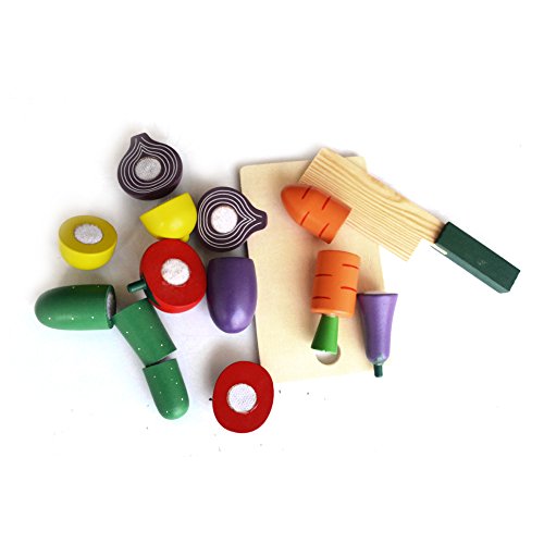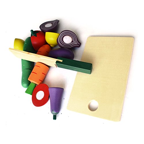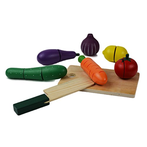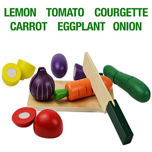 The cutting food for toddlers set comes with 6 vegetables (onion, carrot, lemon, aubergine, tomato and courgette),1 chopping board and 1 wooden knife.