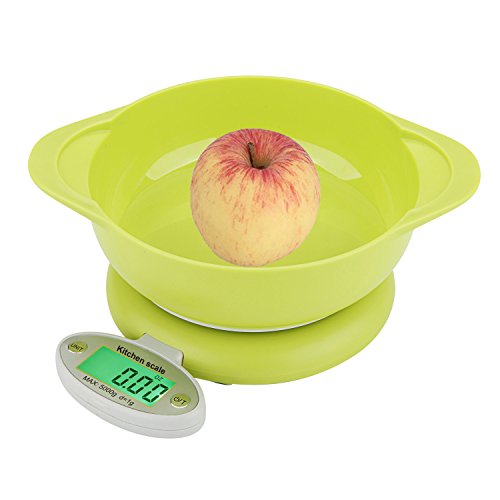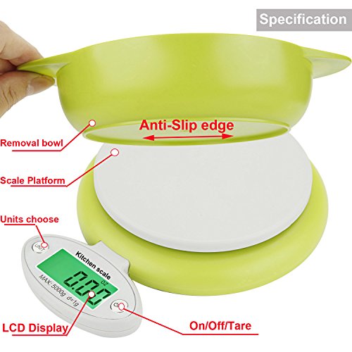 Digital Kitchen Food Scale 5kg/11lb for Baking and Cooking, With Removal bowl tray, Accurate Weighing Scale with Foldable LCD Display and Hook hole, Slim round shape, ABS Green