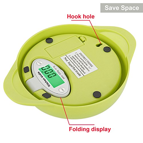 - LIGHT WEIGHT, SAVE SPACE :The LCD display is fold-able, the weighing platform can be put into the bowl, Provide a hook hole to hang on the wall, perfect for storage and save place in your kitchen.