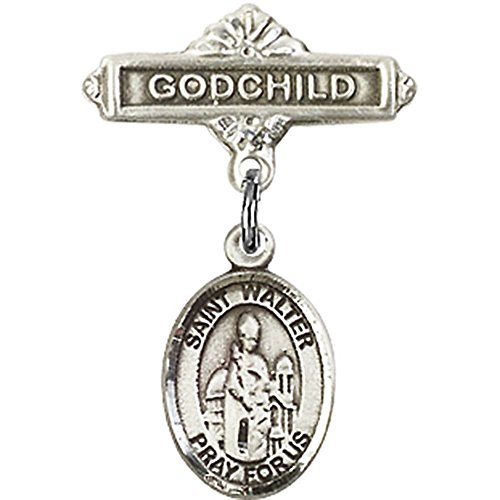 -. Title : Sterling Silver Baby Badge with St. Walter of Pontnoise Charm and Godchild Badge Pin 1 X 5/8 inches