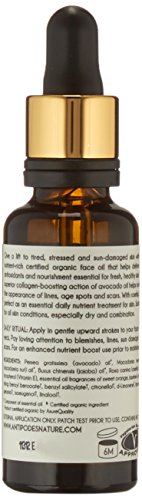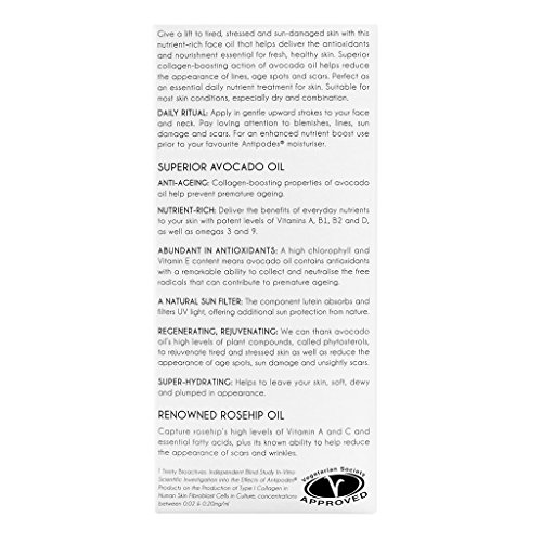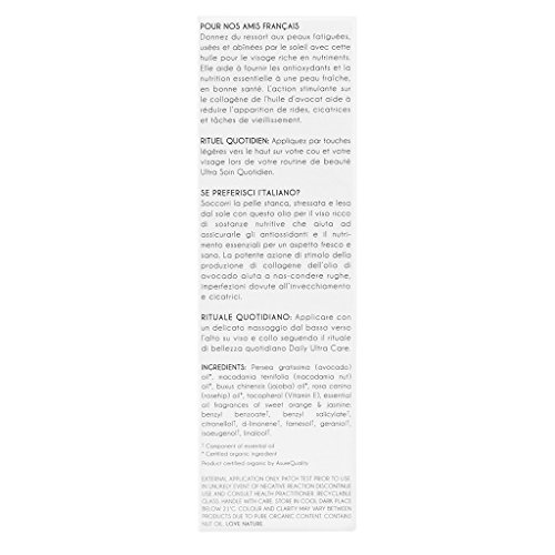 Light yet deeply-penetrating, non-greasy oil with a base of 100% pure avocado oil. This dazzling emerald oil reflects its high chlorophyll content, which is nature's own special antioxidant. It's full of essential fatty acids like Omega 9 to keep your skin strong and hydrated. With its gorgeously entrancing fragrance of ylang ylang, sweet orange and jasmine, your skin will be glowing with good health and will look and feel simply divine. Apply at sunrise or sunset by lightly stroking into your face, neck and cleavage. A fabulous base for makeup or night time nourishment. 25mlFeature