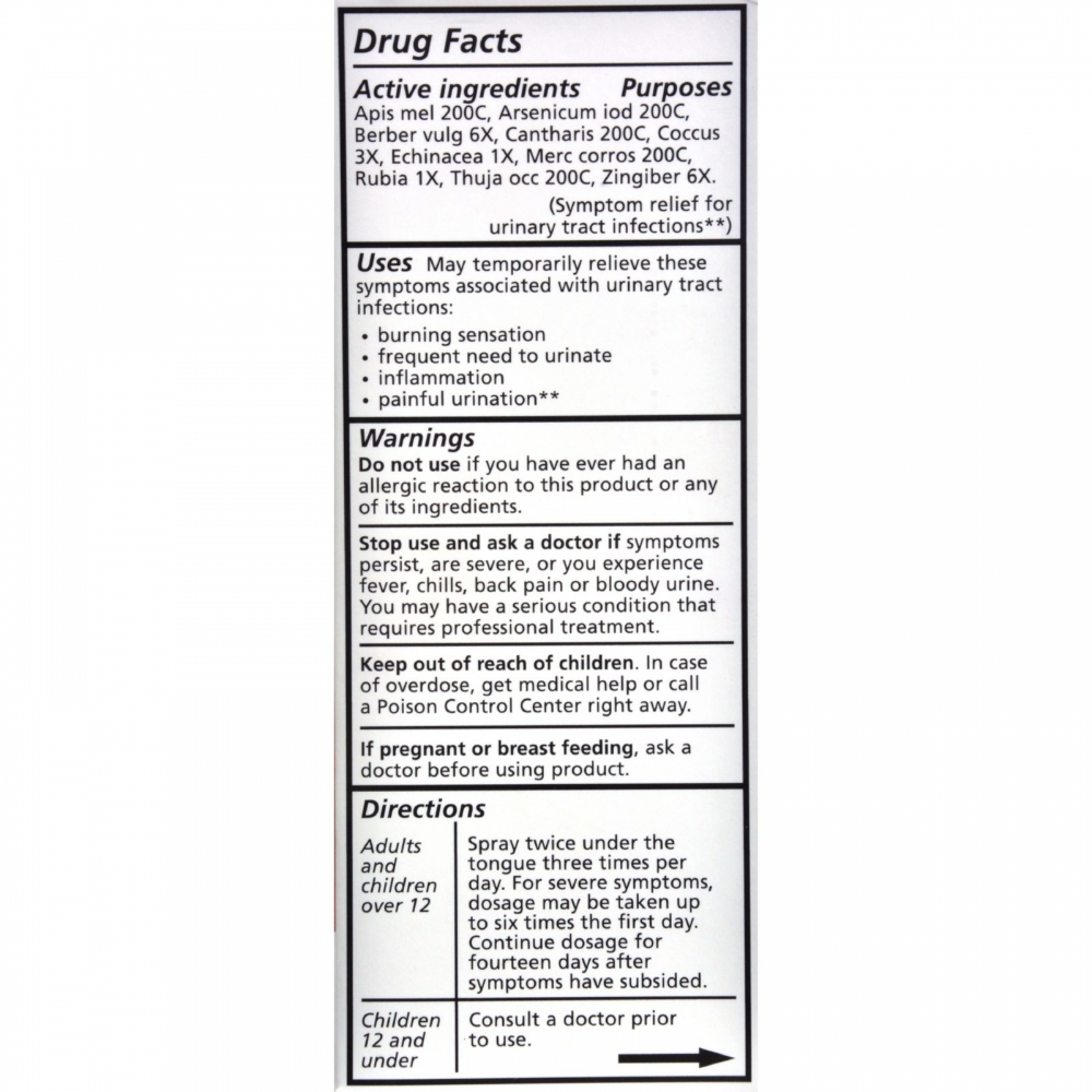 | Liddell Homeopathic Bladder and UTI Spray Description: Relieves Urinary Tract Infection Symptoms: Burning Inflammation Frequent and Painful Urination Doctor Formulated Are you prone to Urinary Tract Infections? Once UTI's start occurring, many of us are likely to continue having them. We know that frequent and uncomfortable urination, a burning sensation and inflammation can seem unbearable. This convenient homeopathic oral spray makes it easy to get the safe, effective and natural holistic relief you deserve. Try it, many women swear by it! Relieves symptoms associated with urinary tract infections, such as: Burning sensation Frequent need to urinate Inflammation Uses: Temporarily relieves these symptoms associated with urinary tract infections: Burning sensation, frequent need to urinate, inflammation, painful urination. Disclaimer These statements have not been evaluated by the FDA. These products are not intended to diagnose, treat, cure, or prevent any disease.Size : 1 FZ Pack of : 1 Product Selling Unit : each |