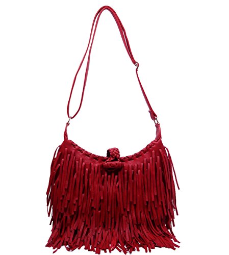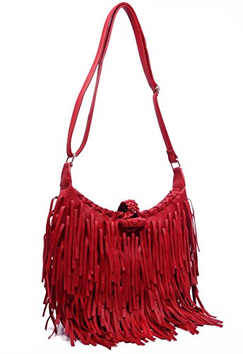 Pink Haley, Double Sided Fringe, Adjustable Crossbody Hobo- Red