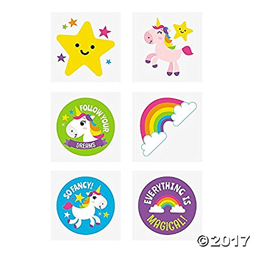 Studio : Oriental Trading Co Publisher : Oriental Trading Co Binding : Health and Beauty Product Description Rainbow Unicorn Tattoos make every unicorn party guest want to get "inked" like their friends. OMG - what could be cuter than matching unicorn tattoos? Use these temporary tattoos at parties, carnivals, fairs and more. Make unicorn parties more magical with these fun party favors. Easy to apply and remove. Paper. (6 dozen per unit) 1 1/2" Safe and non-toxic. 0