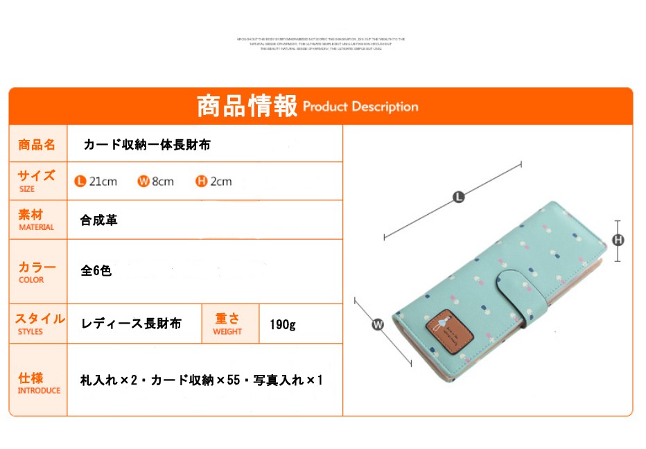 レディース用長財布カラー:全6色本体サイズ:約21cm×8cm×2cm仕様:カードポケット55枚収納、札入れ素材:合成革生産地:中国キーワード:カード大容量 55枚収納 婦人用 女性用 ポイントカード入れ 会員証入れ 定期入れ レディース プレゼント 贈り物 バッグ 財布 さいふ サイフ 札入れ ギフト 人気 長財布 メンズ 財布 大容量 デザイン フェイクレザー 財布 人気 送料無料