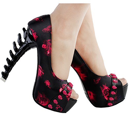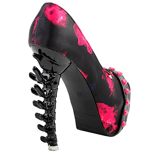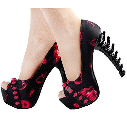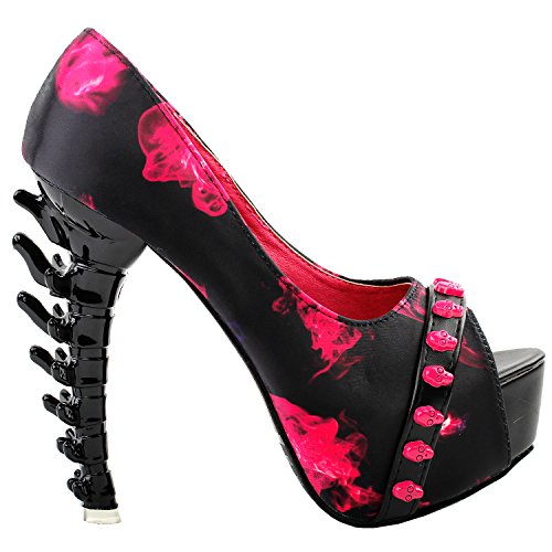 Show Story Black Hot Pink Skull Band Peeptoe Platform Bone Heel Club Pumps,LF80654