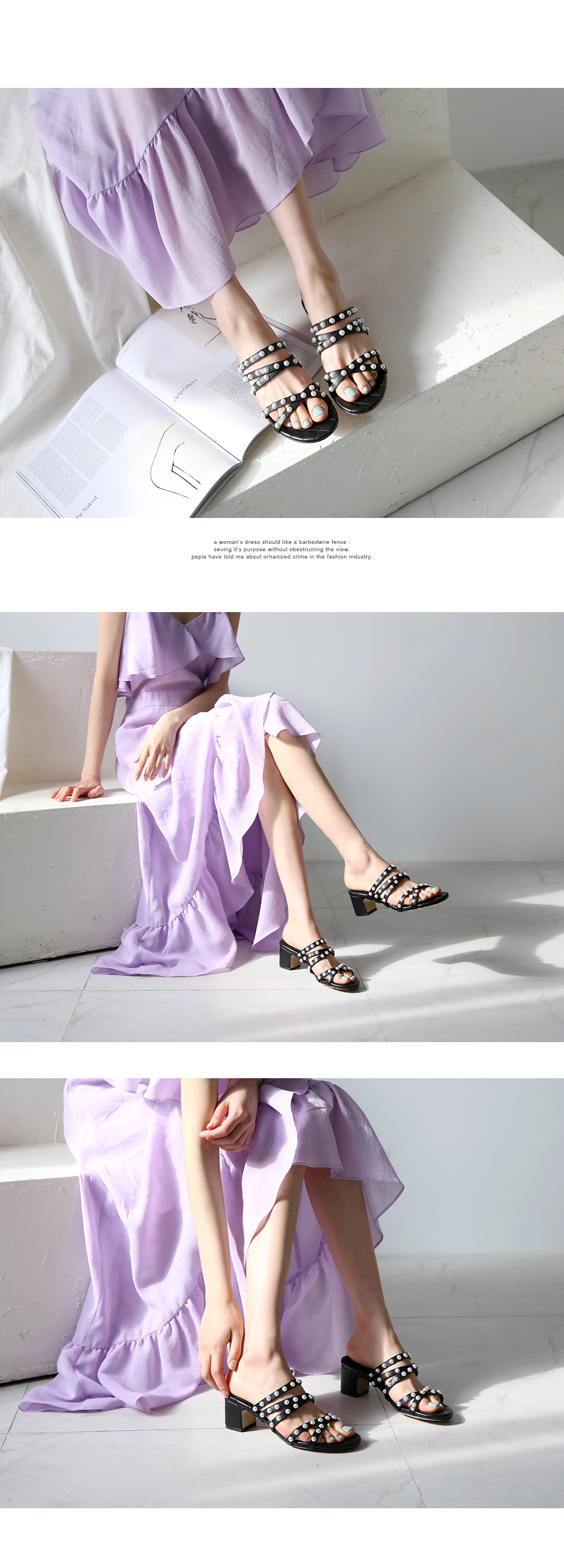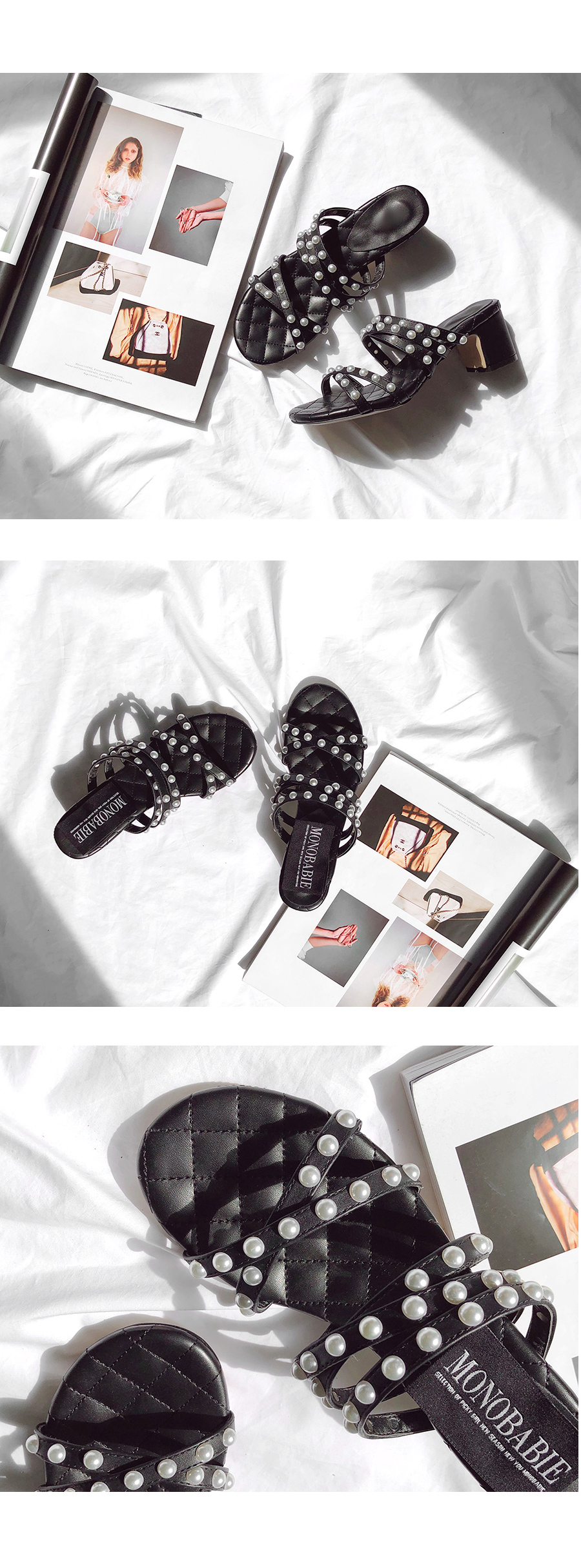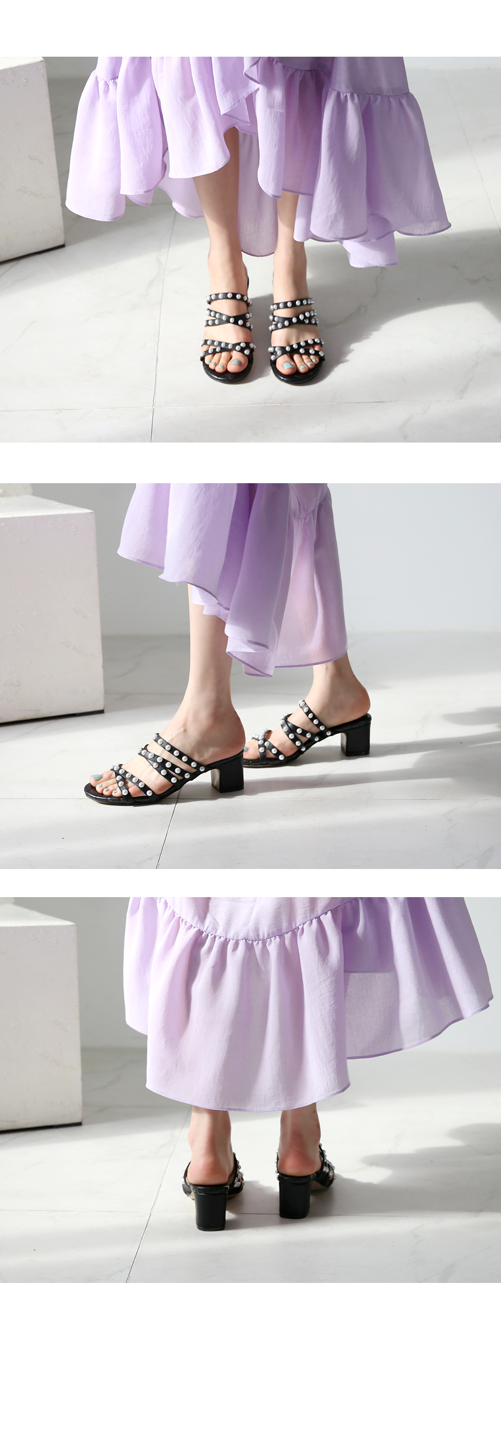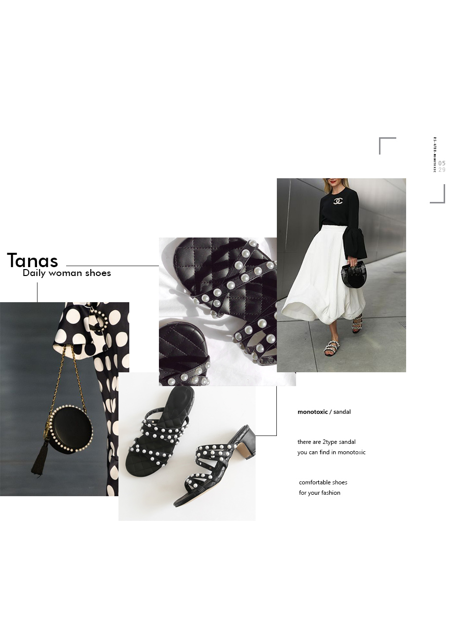 인조소가죽 소재의 스트랩에 진주가 포인트로 박혀있어 세련미 돋는 샌들입니다.