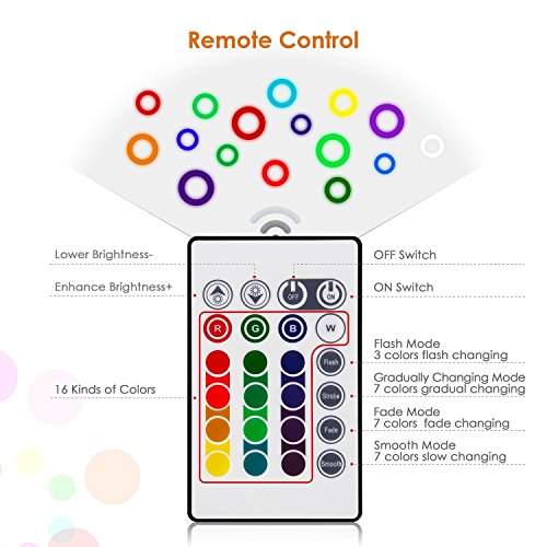 - 【Remote Control】Use the remote to choose different modes(Flash, Gradual, Fade, Smooth), colors, brightness. The remote distance is 3m / 9.84ft