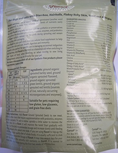 Flora4TM Raw Food Topping simplifies the chore of learning how to supplement effectively to add the live probiotics, plant enzymes, phytonutrients and whole food vitamins & minerals that are lacking in an all-meat canine diet. Flora4 contains only 100% raw organic sprouted seeds (a blend of barley seed, flaxseed, and lentils) ground into a fine powder. This versatile mix can be sprinkled into raw and home-cooked food, or even commercial kibble to boost nutrition and complete the diet. Our testing has shown that dogs love the mix of flavors from meat + our sprouted seed blend. Flora4 gives Raw feeders the convenient whole food supplement they've been waiting for - no need to use bottled synthetic products again! Today most dog foods rely on synthetic chemicals to complete their nutritional profile. As a result, many pets do not get the micro-nutrients and synergistic benefits only available in the vitamins and minerals naturally found in real food. Flora4 can provide your pet the missing nutrition just as nature intended.Flora4 perfectly supplements raw and home cooked diets with highly bio-available plant-based vitamins, minerals, enzymes and live probiotics, complementing the nutrients found in meat and creating a nutritionally complete diet conveniently and without any processed foods!These plant-based enzymes in Flora4 are biologically active in a broad pH range, which means they support your dog's healthy gut flora in a larger portion of its digestive tract, where pH levels can vary considerably.Flora4 also adds soluble fiber to your pet's diet, keeping intestines functioning smoothly and also helping keep your dog feeling full longer. Perfect for dogs eating a raw diet without much volume. Flora4 can be added to any kibble to provide super-food nutrition that your dog can easily metabolize. By simply adding Flora4 to you dog's diet, at the very least, they will make better use of the food they are already eating.