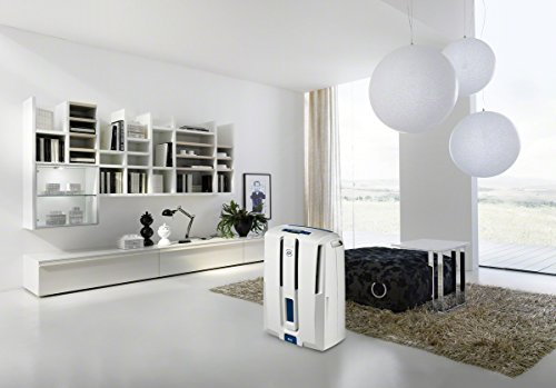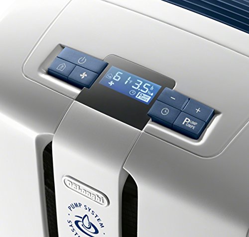 Ideal for rooms up to 1,000 sq. ft. in total area, the De'Longhi DDX70PE 70-Pint Dehumidifier with pump is the simple way to improve the air quality in your home without a complicated setup. You can simply select your ideal humidity level and breathe in the fresh air. It is the ultimate in home comfort convenience with its patented True Pints Per Day pump system that continuously discharges moisture so you don't have to constantly drain a water bucket. Water removal is simple: With its hassle-free pump system, simply drain the water out a window or a drain sink up to 16 feet overhead with the included hose. You can also choose to drain the water passively through the 3-ft. gravity feed hose or simply empty the water into the removable water tank, which is frontally located for easy access. The transparent water level window lets you see how much water has been collected if using the tank option. The De'Longhi DDX70PE 70-Pint Dehumidifier also features LCD electronic controls that allow you to select the ideal humidity level by adjusting the humidistat, a 24-hour on/off timer, antifrost setting and 2-speed fan. The DDX70PE is the perfect dehumidifier for a cleaner, healthier home.Feature