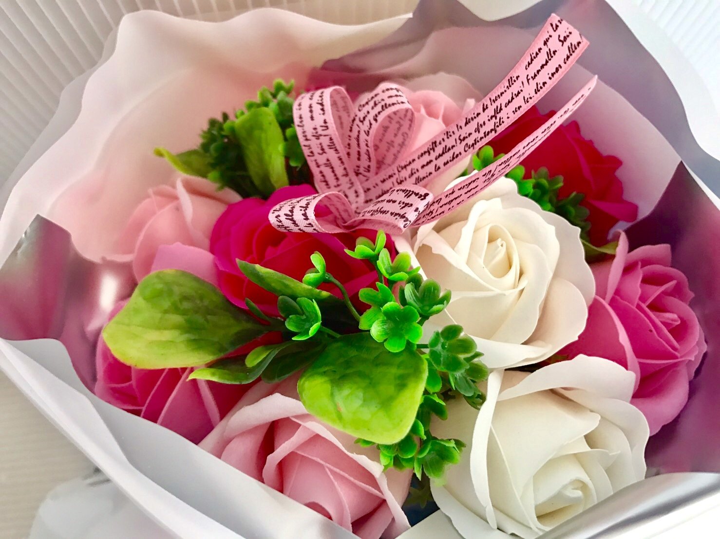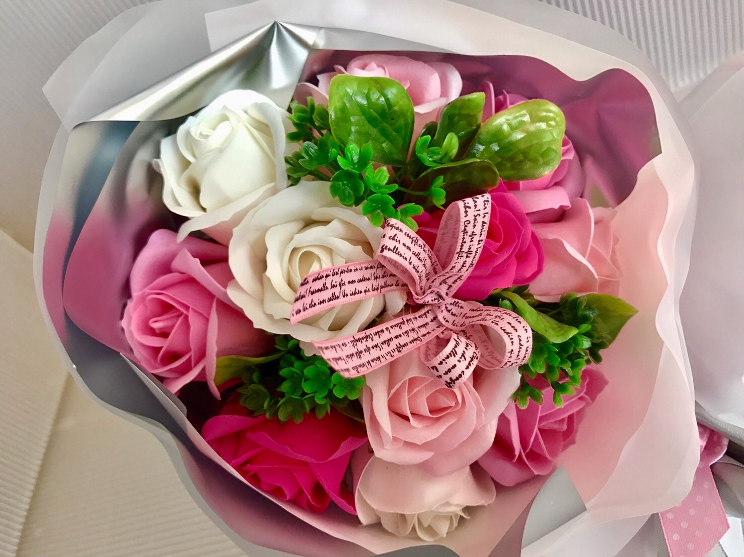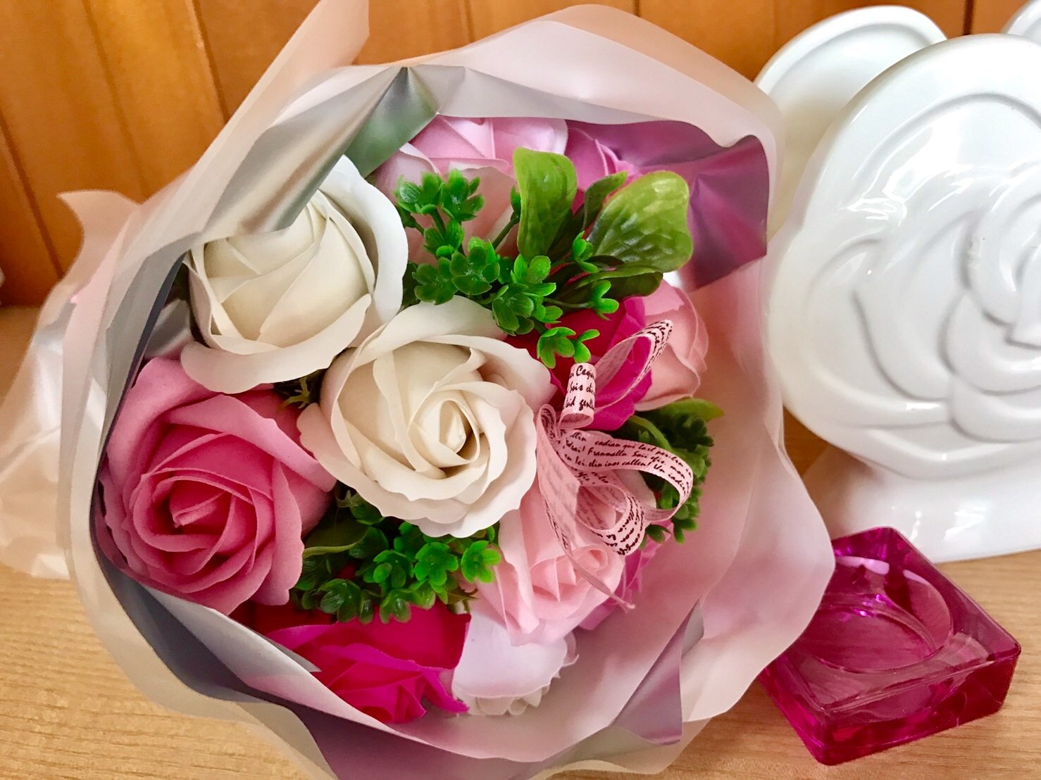 Since the bouquet is in a gift bag, various decorating methods can be done.