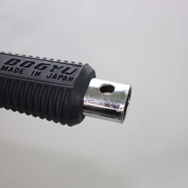 パイプ径を太くし折れの強度UPに加え、接触面積の増加により抜け強度が更にUPしております!また、貫通式にする事により柄穴とパイプの接触面積を増やし、ヘッド部に柄付後、貫通したパイプを逆方向から拡げました。万一パイプが抜けかけても、目視で確認する事が出来ます。 |