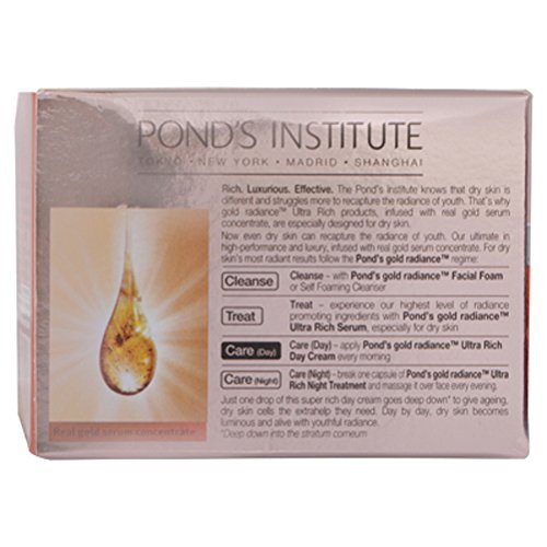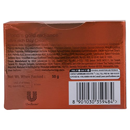 -. Binding : Health and Beauty -. Brand : Pond's -. EAN : 8901030359484 -. Feature : Especially designed for dry skin for a luminous appeal / Reveals the skin's youthful radiance / Repairs skin aging / Keep your skin young and supple with Pond's gold radiance ultra rich day cream. / Please read the below description for more information of this product. -. Label : Ponds -. Manufacturer : Ponds -. MPN : 12669 -. PackageQuantity : 1 -. PartNumber : 12669 -. ProductGroup : Beauty -. ProductTypeName : BEAUTY -. Publisher : Ponds -. Studio : Ponds -. Title : Ponds Gold Radiance Ultra Rich Day Cream, 50g