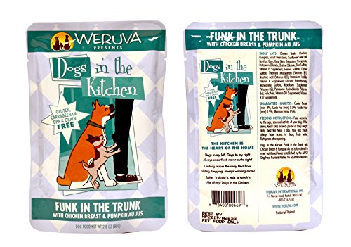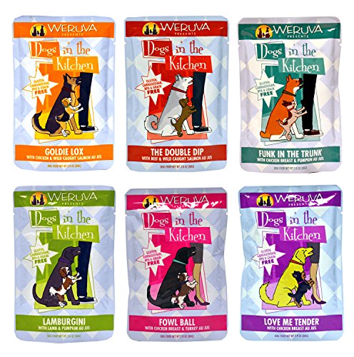 -. Feature : Weruva Dogs in the Kitchen Variety Pack - 6 Fun Flavors including The Double Dip, Lamburgini, Fowl Ball, Love Me Tender, Funk in the Trunk, & Goldie Lox / Gluten, Carrageenan, BPA, Starch, GMO, MSG, and Grain Free / Each Easy-Tear Pouch is Individually Sealed / 2.8 Ounces Each (6 Total Pouches)