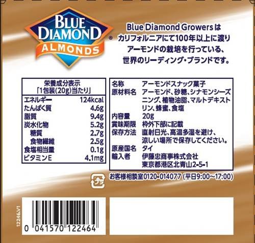 原材料:アーモンド、砂糖、シナモンシーズニング、植物油脂、マルトデキストリン、蜂蜜、食塩