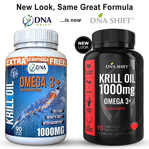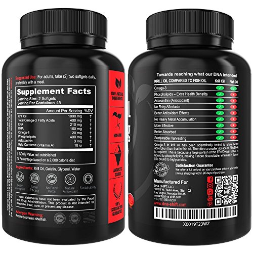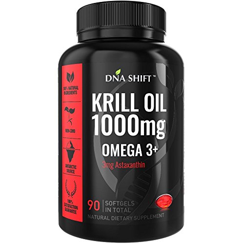 HIGH DOSAGE ASTAXANTHIN: DNA-Shift Krill Oil 1000mg provides a potent formula containing 400mg Omega 3 fatty acids (210mg EPA & 160mg DHA), 20mg Omega 6, 3mg astaxanthin, 400mg phospholipid and 10iu Beta Carotene (Vitamin A) per daily serving of 2 softgels