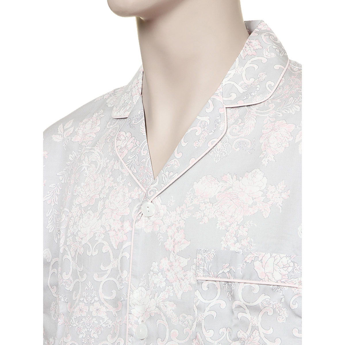 그레이 컬러와 핑크 컬러가 매치된 중성적인 프린트 제품이며 상의 왼쪽 가슴에 주머니가 있어 실용성이 높은 디자인입니다.