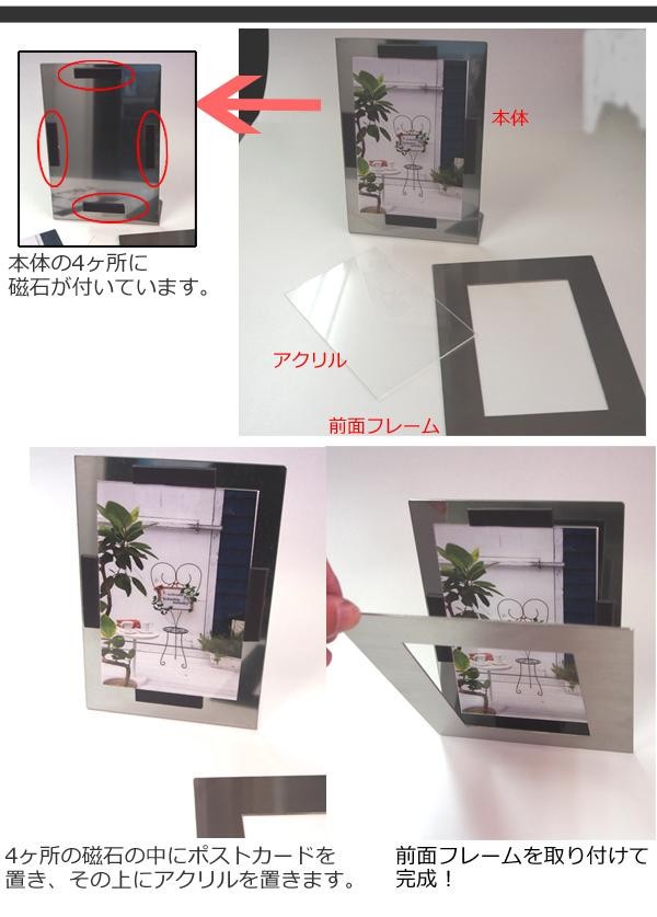 本体のマグネットに前面パネルをとりつけるだけ!!カードの交換が簡単なフォトフレームです。