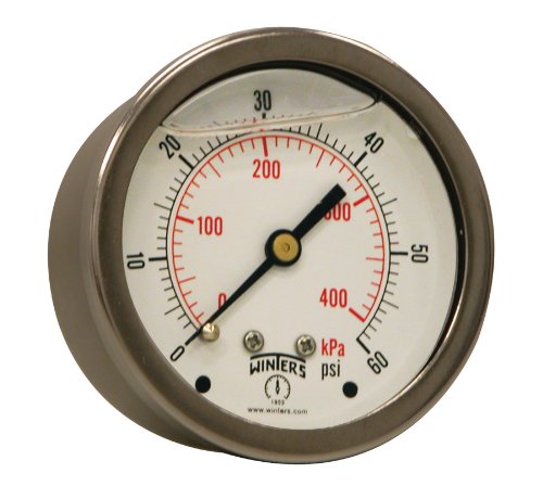 Winters PFQ Series Stainless Steel 304 Dual Scale Liquid Filled Pressure Gauge with Brass Internals, 0-60 psi/kpa,2-1/2" Dial Display, +/-1.5% Accuracy, 1/4" NPT Center Back Mount