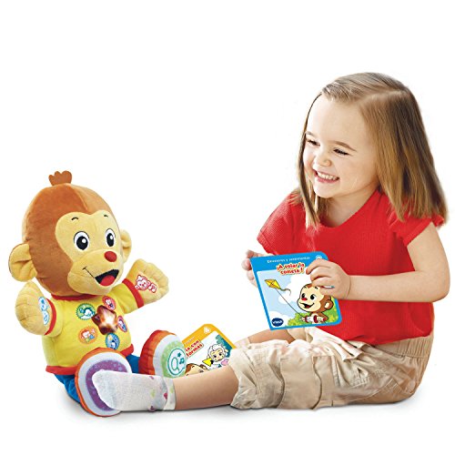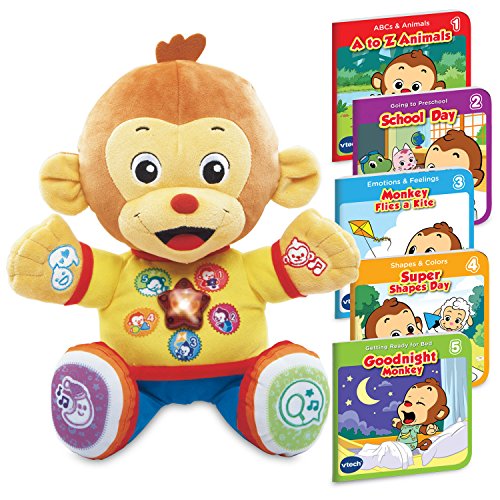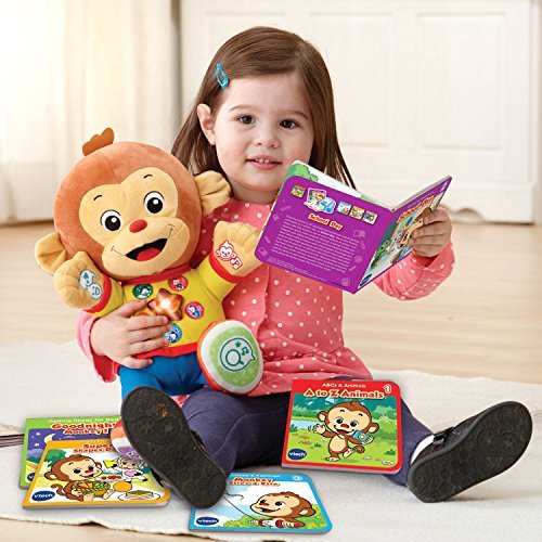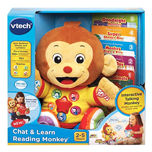 -. Binding : Toy -. Brand : VTech -. EAN : 3417761822005 -. Feature : Plays bedtime stories and lullabies; can imitate and respond to your child / 5 colorful books reinforce reading comprehension; teaches fun facts about the human body / Reads all 5 stories and plays 15 minutes of lullabies in bedtime mode / Records and remembers your child's name; includes 100+ responses, facts and questions / 110+ songs, melodies, sounds and phrases. 2 AA batteries are required for operation and are included -. IsAdultProduct : 0 -. Label : VTech -. Manufacturer : VTech -. MPN : 80-182200A -. NumberOfItems : 1 -. PackageQuantity : 5 -. PartNumber : 80-182200A -. ProductGroup : Toy -. ProductTypeName : TOYS_AND_GAMES -. Publisher : VTech -. Studio : VTech -. Title : VTech Chat And Learn Reading Monkey