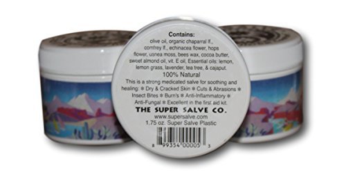 Super Salve is an antioxidant salve for the soothing and healing relief of dry and cracked skin, chapped lips, abrasions, eczema, and insect bites. Fights free radicals. A potent medicinal herbal salve created for the harsh environment of the desert southwest. Originated for Grand Canyon river runners and hikers. • Chaparral Leaf - slows down the rate of bacterial growth and kills the bacteria with anti-microbial activity. Great in the first aid kit for skin abrasions and injuries. • Echinacea Flower - has caffeic acidglycoside, which reacts with other substances in the body's cells. This facilitates the wound healing process. Excellent for drawing out poisons such as ant bites, bee stings, jellyfish stings, and many more. • Hops Flower - A very powerful herb for decreasing painful swelling and inflamed pneumatic pain. Contains two antibiotic substances: humulon and lupulon, both effective on staph and other skin bacteria. • Usnea Moss - Usnea, with its usnic acid and other compounds is useful for burns and athletes foot. CONTAINS: Olive oil; organic chaparral leaf; comfrey leaf; echinacea flower; hops flower; usnea moss; beeswax; cocoa butter; sweet almond oil; vitamin E oil; and pure essential oils of lemon, lemon grass, lavender, tea tree, and cajaput. DIRECTIONS: Apply liberally and as often as needed.Feature
