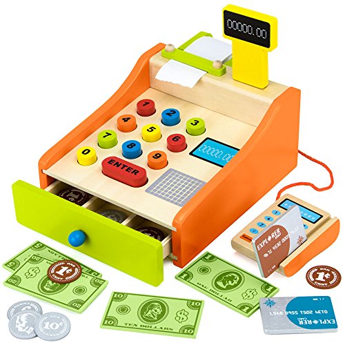 -. Title : Wood Eats! Change & Charge Cash Register with Wooden Coins, Bills, and Credit Cards (22pcs.) by Imagination Generation
