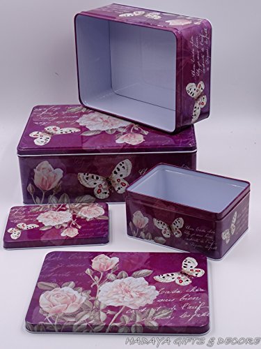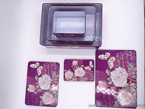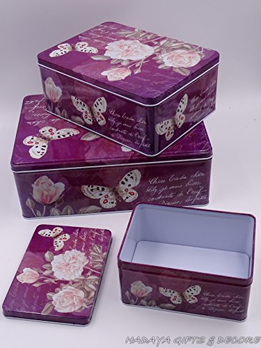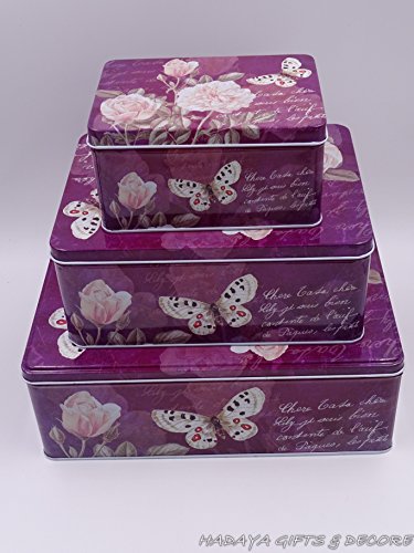 French Style Purple multipurpose storage tins, shabby chic, Set of 3 with beautiful floral & Butterfly design
