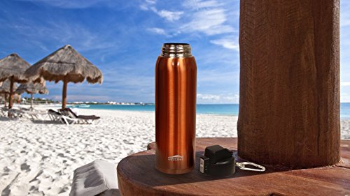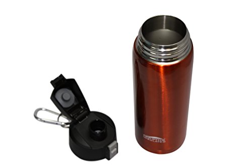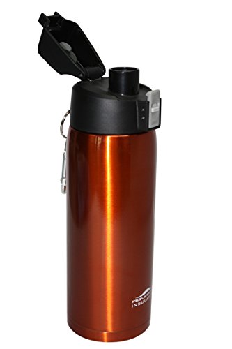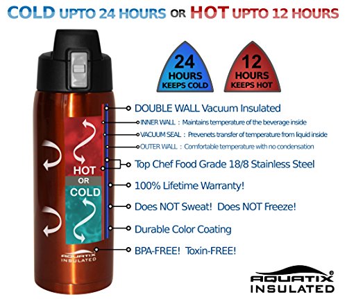 The Aquatix Sporty 32 oz Double Wall Insulated Stainless Steel Water Bottle is perfect for use at the gym, at the office, around your house and anywhere you need to take your beverage of choice with you. Made from durable and sturdy PREMIUM QUALITY, Top Chef 18/8 FOOD GRADE STAINLESS STEEL, this Aquatix Sporty 32 ounce water bottle is a great eco friendly sports bottle. The double wall insulated water bottle is PERFECT for carrying while walking, hiking, camping, use at the gym or just on the go- as it fits MOST car cup holders. No more spills and messes while driving! Ditch those plastic water bottles! GO HEALTHY with this BPA Free, FOOD GRADE stainless steel water bottle that holds a large capacity of liquids 32 fluid ounces and no longer worry about toxins and chemicals leaching into your beverage. Drink crisp, clean, healthy and refreshing drinks from Your Aquatix Water Bottle every time. Just Fill and Go! This sporty bottle features a flip top spout drinking mechanism allows the ease of staying hydrated even while on the go! The flip cap top provides single-handed drinking ability and is perfect for your busy life on the go! Stay hydrated and DRINK MORE WATER with this large capacity 32 ounce water bottle. Double vacuum insulated wall construction contributes to hot teas, soup, coffee or other blends being consistenly hot for up to 12 hours. And, for cold water, smoothies, soft drinks, or anything you may need very cold, 24 hours of insulated confidence, guaranteed cold, period! The bottle will not "sweat", meaning it will not create condensation which may leave a "ring" of liquid on your expensive buried walnut side table. Easy to hand wash or clean, NO aftertaste after cleaning. COLD LIQUIDS or HOT LIQUIDS! This is a double wall insulated water bottle that is made of 18/8 food grade stainless steel water bottle! No other bottle has all the features of our Aquatix Sport Bottle!Feature