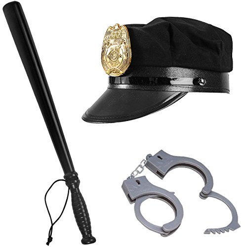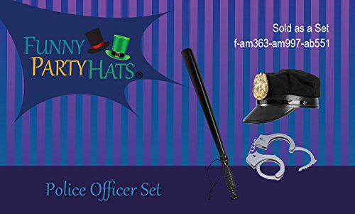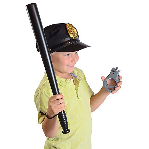 Walk the beat in this fabulous hat, stick and cuffs set. This is a great accessory set for any holiday party. This black police hat is regulation for any junior officer. A great addition to any costume. This child's gear is perfect for dress up and role playing games. Look like true law enforcement hero with this hat on your head, stick in hand, and cuffs in your back pocket.Feature