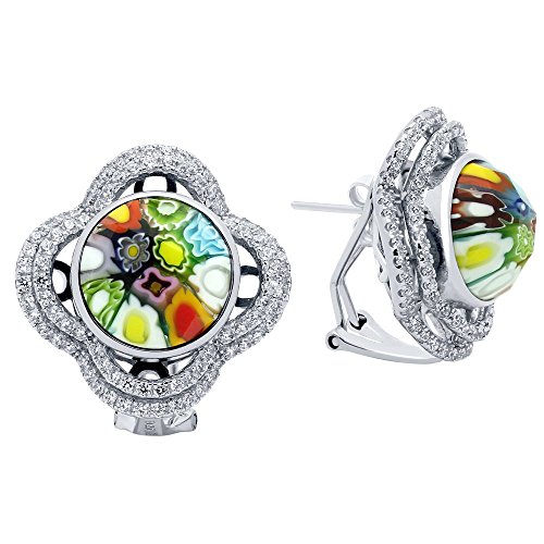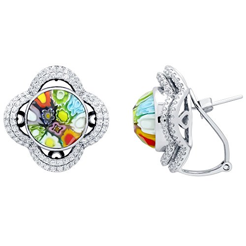 -. Title : Round Multicolor Millefiori With Double Clover Cubic Zirconia Design Earrings Rhodium Plated Sterling Silver