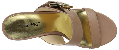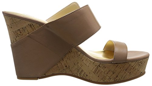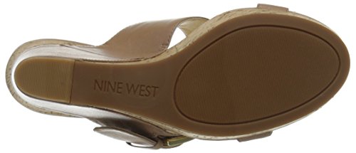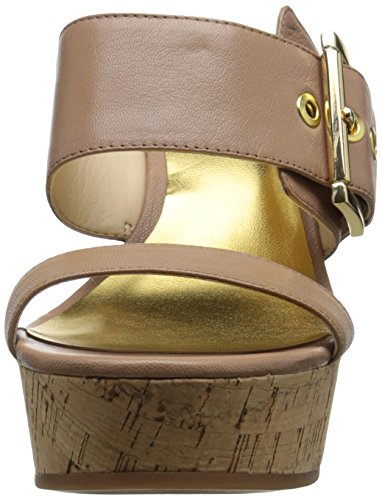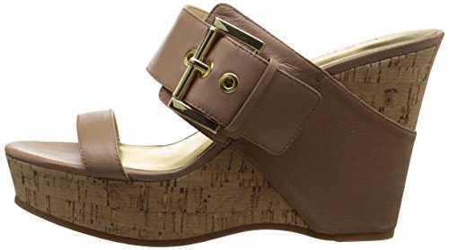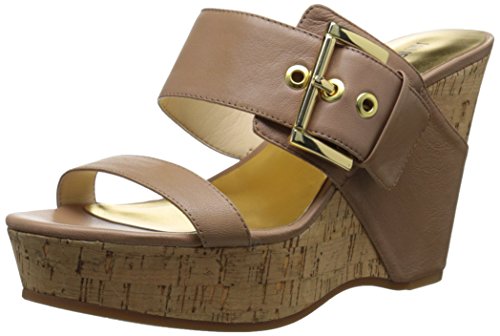 Platform-wedge sandal featuring wide leather strap with metallic grommets and buckle closure
