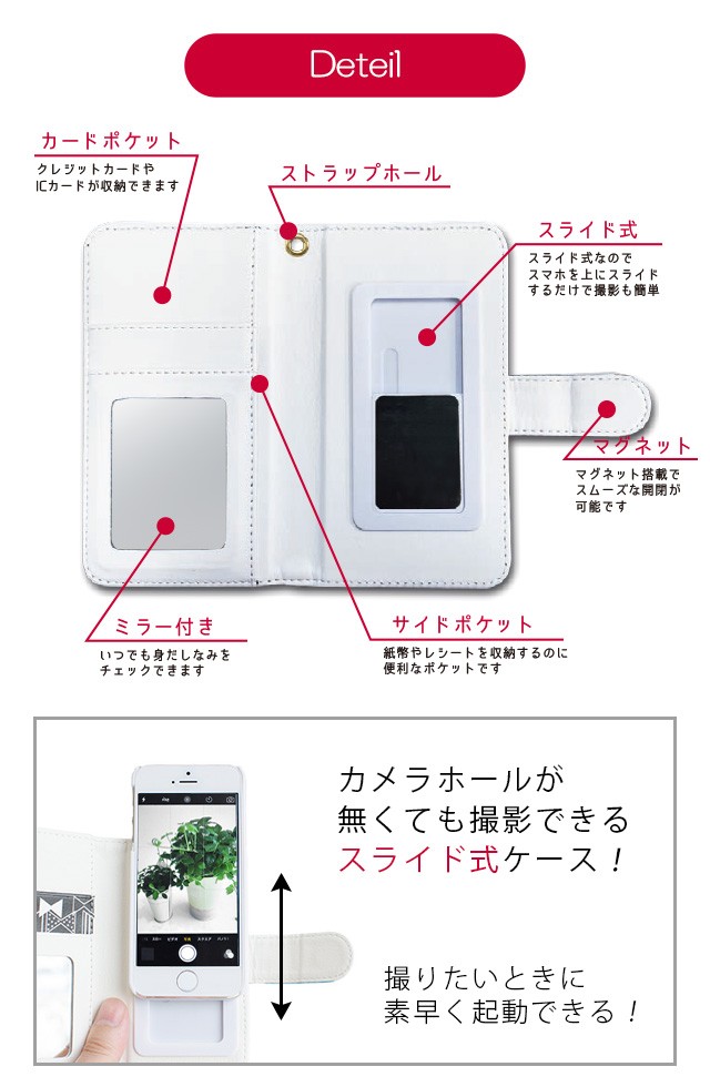 ■素材PUレザープラスチック(ポリカーボネート)■特徴【特徴1】 好きなカードを2枚まで収納可能!【特徴2】 ストラップホール搭載! 【特徴3】 写真が撮れるスライダーシート搭載!【特徴4】 コンパクトミラー搭載!■製品について※強い衝撃や振動から守るものではありません。※本商品は商品紹介画像とケースの形状(カメラ穴等)が若干変更となる場合がございます。■カテゴリキーワードテキスタイル 北欧