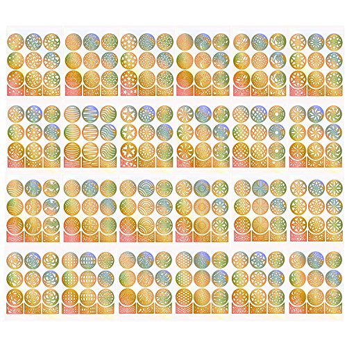 Each sheet is about 3.46 x 3.1 inch, consisting of 12 small pieces (single round sticker diameter is 0.91 inch); Quantity: 24 sheets nail vinyls, 288 pieces in total. 3 Patterns each sheet, 24 sheets totally has 72 assorted patterns.