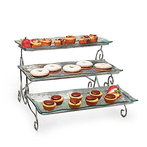 -. Feature : SET OF GLASSWARE - Wow your guests with these 3 pieces fine glass plates in silver tone metal platter stand 13.5 inches long, 9.75 inches high and 14 inches deep. The rectangular layers are of the same sizes 14 inches long and 5.75 inches wide, sufficient to cater a generous number of tea sandwiches, assorted slices of bread, pastries, fruits, and snacks. Uniquely designed for neatness, luxurious beauty, and multi-functionality. / GRACIOUS DINING - Reveal your culinary creations of delectable goodies with a home and commercial serving tray. A new party staple, this triple stack of cake stands is perfect for serving luscious dessert, English tea or hors d'oeuvres, cupcakes, delicious appetizers like meats, shrimps, and cheese or almost anything. Elegance is there wherever you place your lavish glassware - countertop, kitchen, buffet table. An ideal centerpiece for an appealing food presentation. / PERFECT FOR ANY OCCASION - The clear 3-step glass dessert stand impresses guests at birthday celebrations, family gatherings, cocktail party, holiday get-togethers, weddings and other events. With its slanting design, family and friends can pick and choose from the selection with ease. Composed with strength, it can also withstand the everyday use. Makes a beautiful gift for your loved ones on their special day. / STURDY CONSTRUCTION - Free yourself from buying a new set of the 3-tiered server every event! Built to last, this stand features three separate shelves - dishes made from the finest crystal and a rack from durable materials formed in curves for stability and striking visual appeal. For added convenience, this serveware is a dishwasher, microwave, and oven safe. Hand wash is recommended for the stand. / SPACE SAVER - Indulge in three tiers of sweet treats! The take-apart design of the treat holder also saves space in your cupboard. Store them all right inside the base for a quick and easy travel to another event location. Putting it together is simple and intuitive so you can assemble it in seconds for your next party.