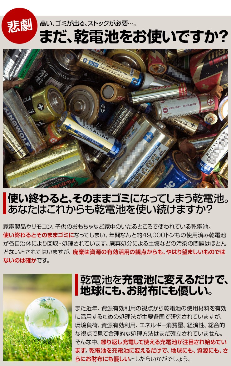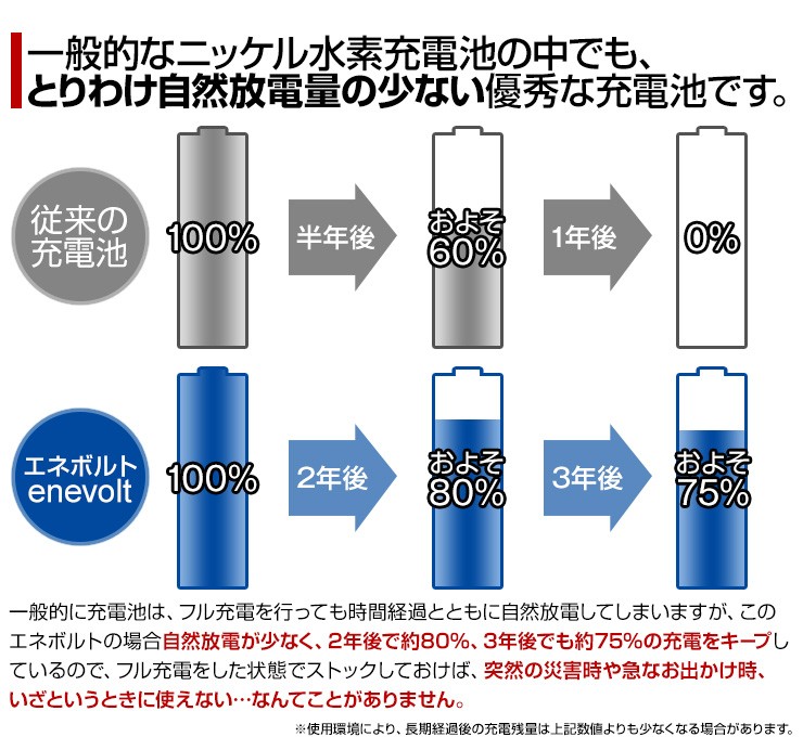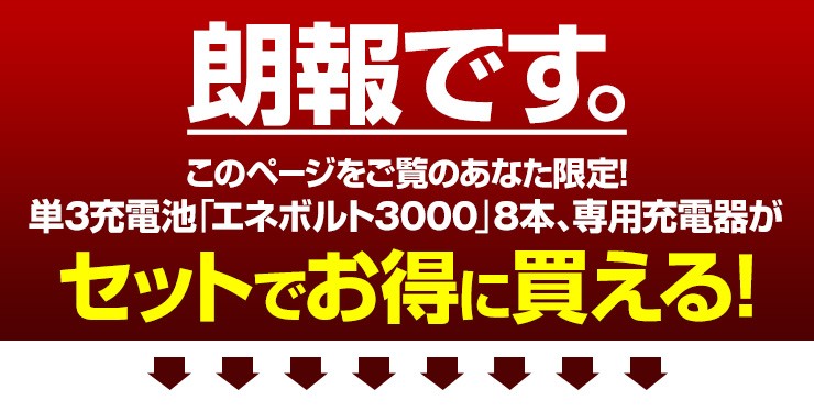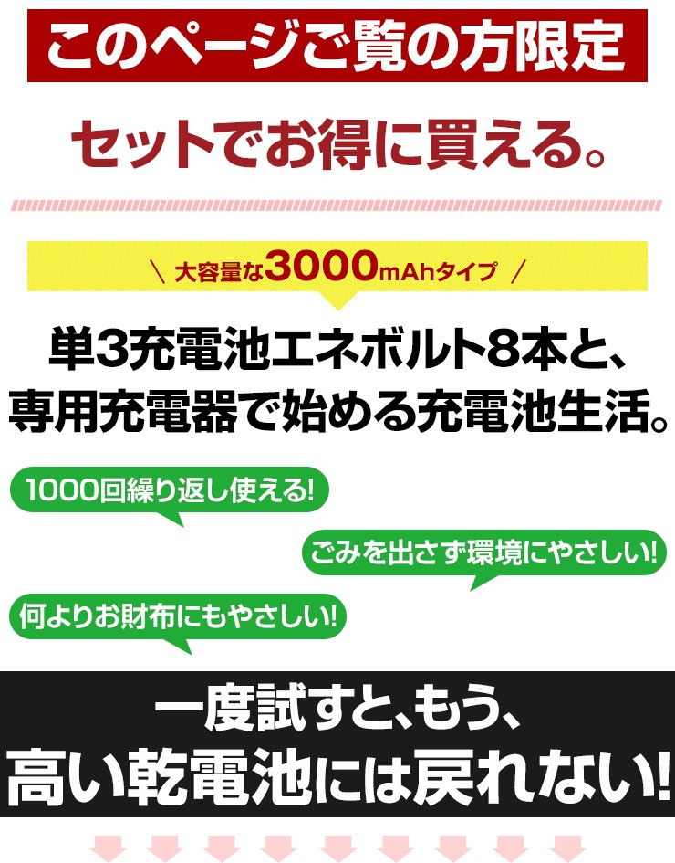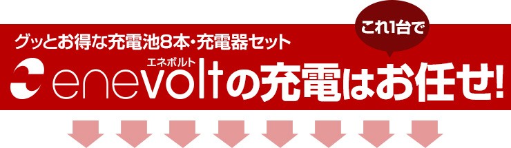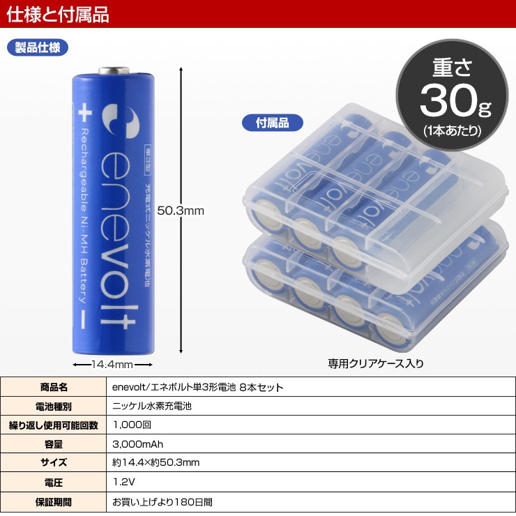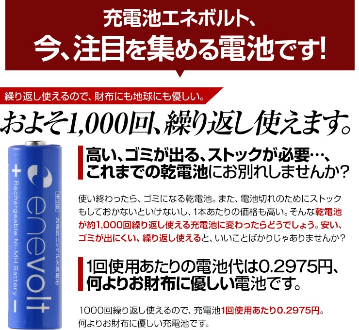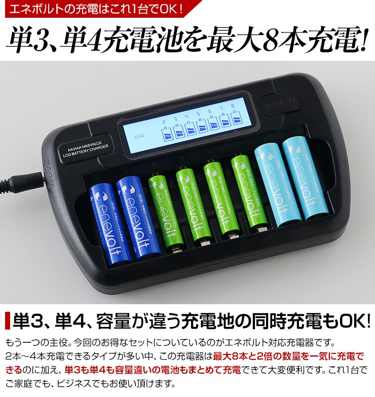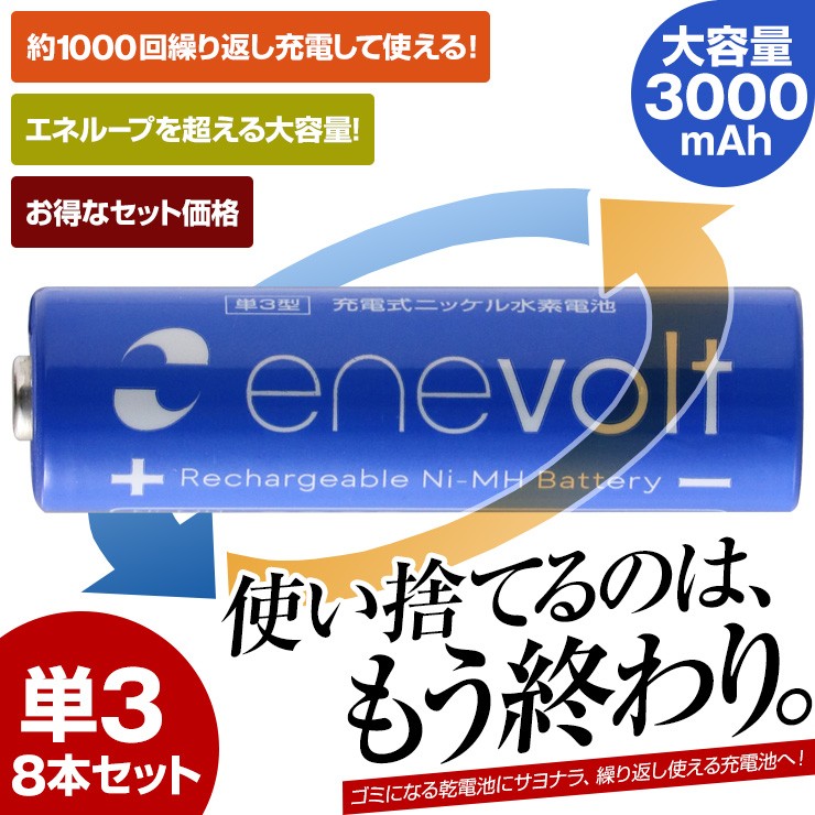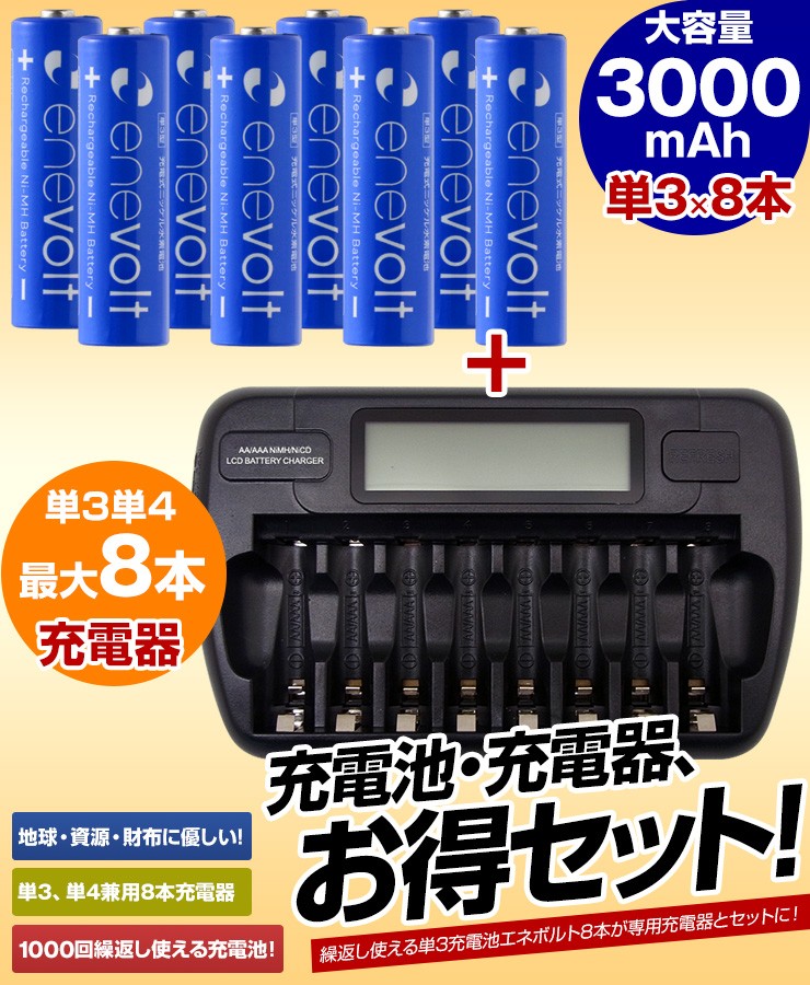 充電池 エネボルト enevolt エネループ eneloop 経済的 エコ ニッケル水素充電池 乾電池 3000mAh 単3 8本セット 充電池用充電器 1000回使える 保証 レビュー記載で送料無料【エネボルトの特徴】●強さ長持ち大容量●1000回繰り返し充電して使えるので、お財布にも地球にも優しい。●自然放電量が少なく、フル充電から3年を経過しても、75%の容量が残っています。●メモリー効果が少なく、継ぎ足し充電に強い。●180日保証だから安心。●充電は、当社enevolt対応の充電器を使用して下さい。●外装ラベルを剥がしたり、傷をつけない。●新旧の電池や充電した電池と放電した電池の混用をしない。●強い衝撃を与えたり、投げつけない。【充電器の特徴】●単3・単4サイズの充電池を同時に8個まで充電できる!(1本だけでも充電でき、単3と単4がまざってもOK)●充電状況がわかるディスプレイ付き!(アニメーションが終わり、満タン表示になったら充電完了です)●電池本来のパワーを取り戻すリフレッシュ機能(完全放電)付き!デジキン