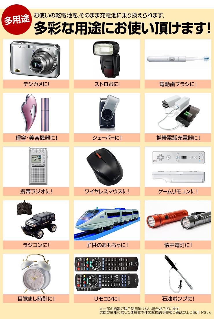 | 対応充電池 | 単3または単4サイズのニッケル水素充電池 (エネボルト/エネロング専用) |