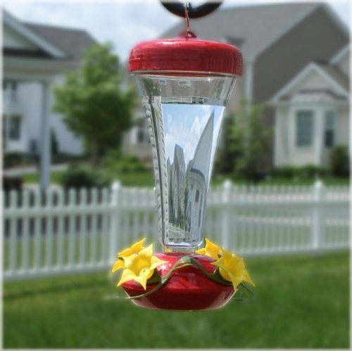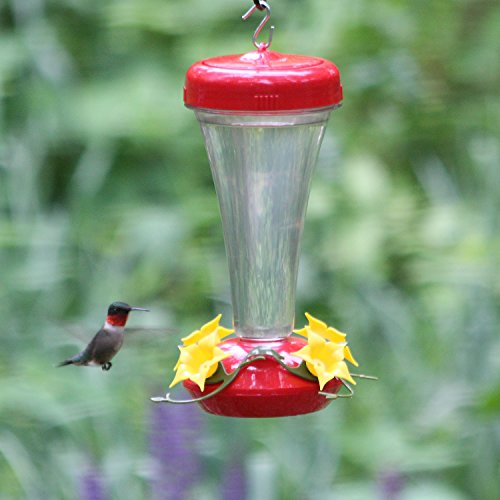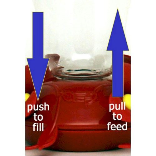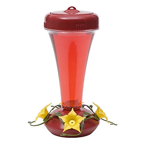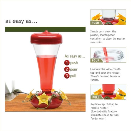 - Feature : Hummingbird feeder with attractive yellow aster flower feeding port design / Advanced push-pull "sports bottle"-like function turns off nectar flow when filling / Wide mouth top-fill design for easy filling / 12-ounce clear plastic reservoir / Easy to clean with fewer parts