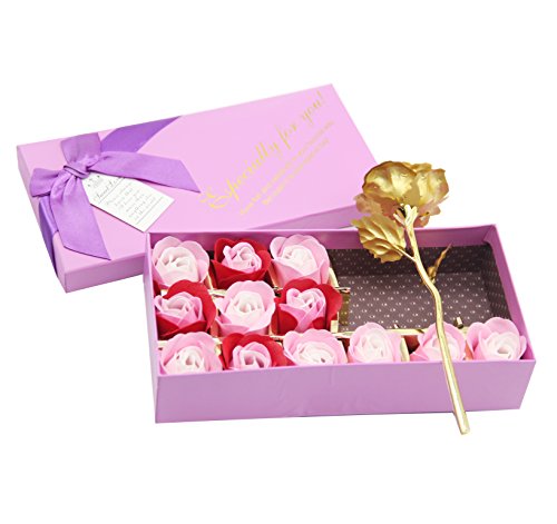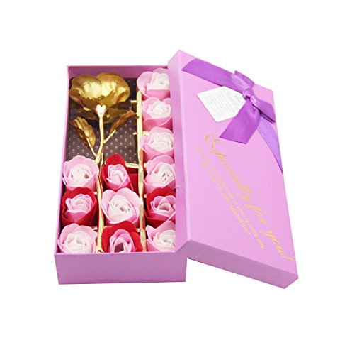 H&W 12 +1 PCS Rose 24K Gold Foil Rose Set Flowers Petals, Soap flower, Romantic Gift Box, Purple (HI1-D1)