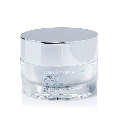 Serious Skincare Glycolic Eye Demand Get younger-looking eyes on demand. Designed to rapidly perk-up and improve the appearance of your entire eye area, this beauty treatment is the perfect way to get exactly what you want when you want it. You demand gorgeous eyes. Serious Skincare delivers. What You Get • 1 fl. oz. Glycolic Retexturizing Eye Demand Rapid Eye Beauty Treatment • Designed to rapidly perk-up and improve the appearance of your entire eye area • Smoothes the look of wrinkles • Temporarily firms the look of skin around the eyes • Temporarily reduces the look of puffiness around the eye area • Effective exfoliating beauty treatment smoothes the appearance of the eye area • Smooth it on, let it set and wipe it off to reveal beautiful, younger-looking eyes • Made in USAFeature