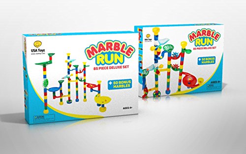 -. Binding : Toy -. Brand : USA Toyz -. EAN : 0645380994985 -. Feature : DELUXE MARBLE RUN: Includes 85 pieces plus 50 bonus marbles so you can really see it all in action / DURABLE: Race down the track easily with parts made of high quality plastic in bright, fun colors / EASY ASSEMBLY: The solid plastic pieces stick together so kids can build the marble game with ease / SKILL BUILDING: Helps develop reasoning skills and hand-eye coordination through building; Ages 4+ / MAKE LEARNING FUN: Teach problem-solving and reasoning in a cool new way; Develop STEM skills -. IsAdultProduct : 0 -. Label : USA Toyz -. Manufacturer : USA Toyz -. MPN : MR85 -. PartNumber : MR85 -. ProductGroup : Toy -. ProductTypeName : TOYS_AND_GAMES -. Publisher : USA Toyz -. Studio : USA Toyz -. Title : Marble Run - Deluxe 85 Piece Marble Track Game - Includes 50 Bonus Marbles -. UPC : 645380994985