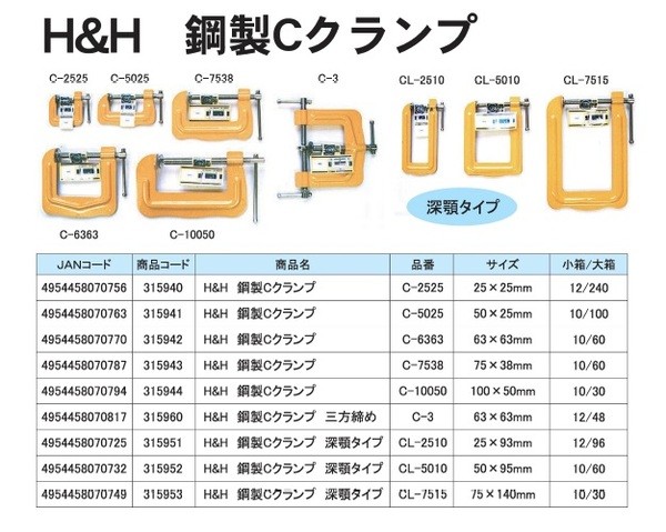 【商品名】(業務用20個セット) H&H C型クランプ/シャコ万力 【三方締め】 63×63mm 鋼製 C-3 イエロー(黄) 〔DIY用品/大工道具〕