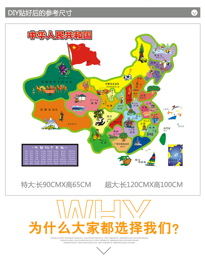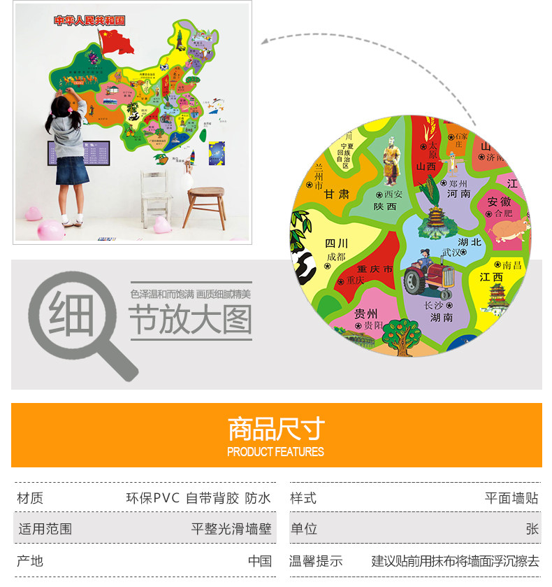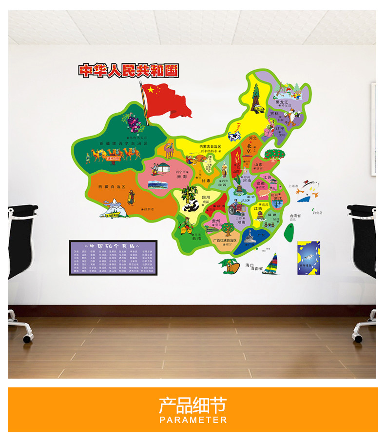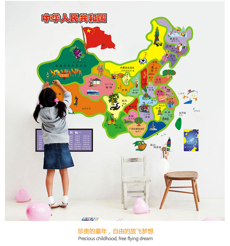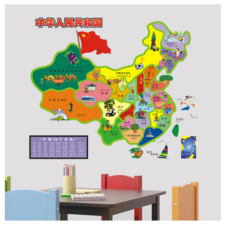 客厅卧室背景装饰防水贴纸卡通中国地图墙贴儿童房间自粘墙纸贴画