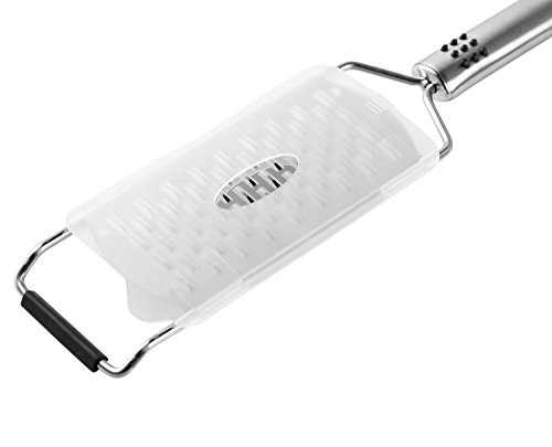 - Has a non-slip rubber grip just above its head to keep it steady on a tabletop during grating. 5" x 2.5" grating area . Generous size allows high performance, quick results. Blade protector to keep safe from extremely sharp blade surface