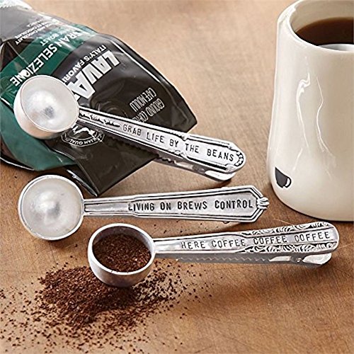 Stamped silverplate coffee scoop features either "LIVING ON BREWS CONTROL," or "HERE COFFEE COFFEE COFFEE" or "GRAB LIFE BY THE BEANS" sentiment and functional clip handle for coffee bag closure.Feature