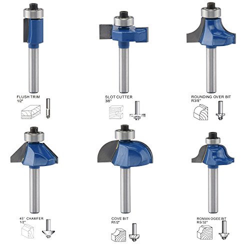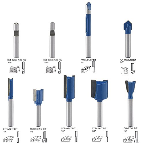 - Set includes: 1/2" Flush Trim Bit; 3/4" Corner Round Bit; 1" Cove Bit; 1/2" 45° Chamfer Bit; R5/32" Roman Ogee Bit; 3/8" Slot Cutter Bit; 1/2" Dovetail Bit; 1/4", 1/2", 3/4" Straight Bits, 1/2" Mortising Bit, 1/4" Panel Pilot Bit, 5/16" Carbide Bevel Trim Bit