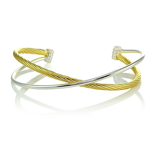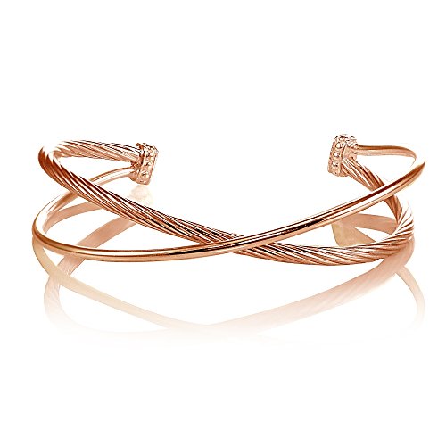 This gorgeous bangle bracelet features a polished & twist criss cross design and the two ends of the bangle are open and adjust to your wrist size.