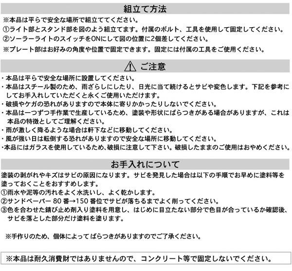 | 付属品 | 単四形充電池×2、ソーラーライト×2、工具(L字レンチ)、ボルト、取扱説明書、保証書(保証期間※ソーラーライト部分のみ:6ヶ月間) |