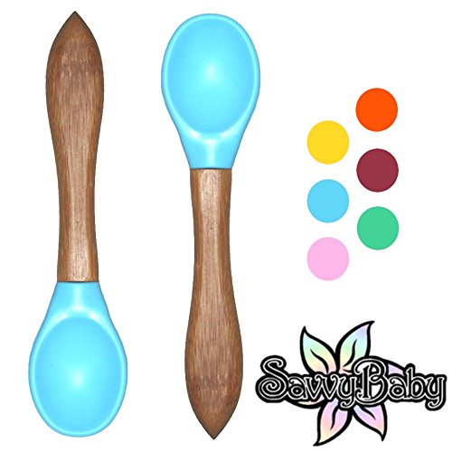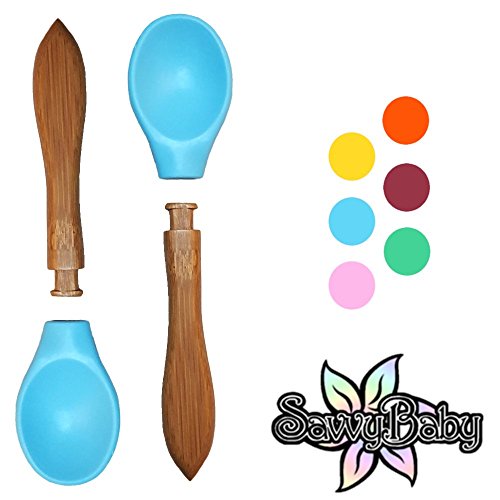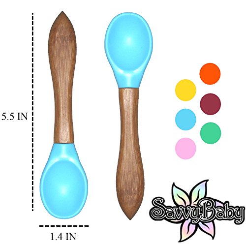 Bamboo Organic Silicone Baby Feeding Spoon | BPA Free and FDA Approved Soft Tip Utensils | by SavvyBaby (Blue)