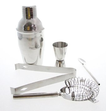 -. Title : Complete Stylish 5-piece Stainless Steel Cocktail Shaker Bartender Tools Set Include Cocktail Shaker, Stirrer, Strainer, Double Jigger, and Ice Tongs.